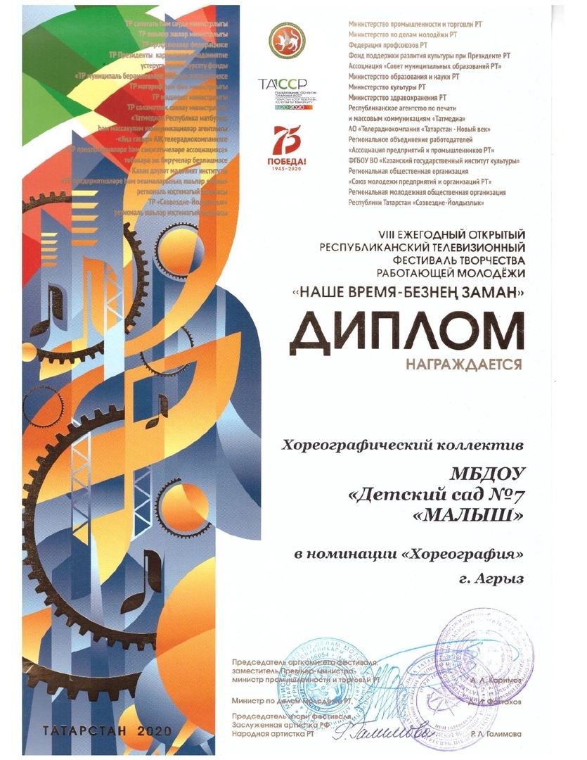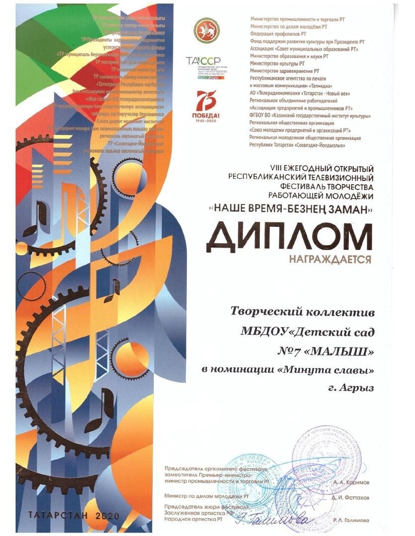 Коллектив детского сада №7 благодарит за предоставленную возможность участия в данном мероприятии Главу Агрызского муниципального района Валеева А.Р., первого заместителя руководителя Исполнительного комитета Гильмутдинову Р.Р., руководителя Исполнительного комитета муниципального образования "город Агрыз" Рахматулина А.М., начальника МКУ «Управление образования Агрызского муниципального района РТ» Сафиуллину В.Г., начальника отдела по молодежной политике Сергееву Т.С. и организаторов фестиваля «Безнен заман».