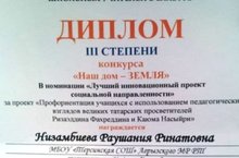Учитель родного (татарского) языка и литературы МБОУ Терсинской СОШ Низамбиева Раушания Ринатовна стала дипломантом III степени в конкурсе «Наш дом – Земля» в номинации «Лучший инновационный проект социальной направленности» в рамках X Международного фестиваля школьных учителей в Елабуге.