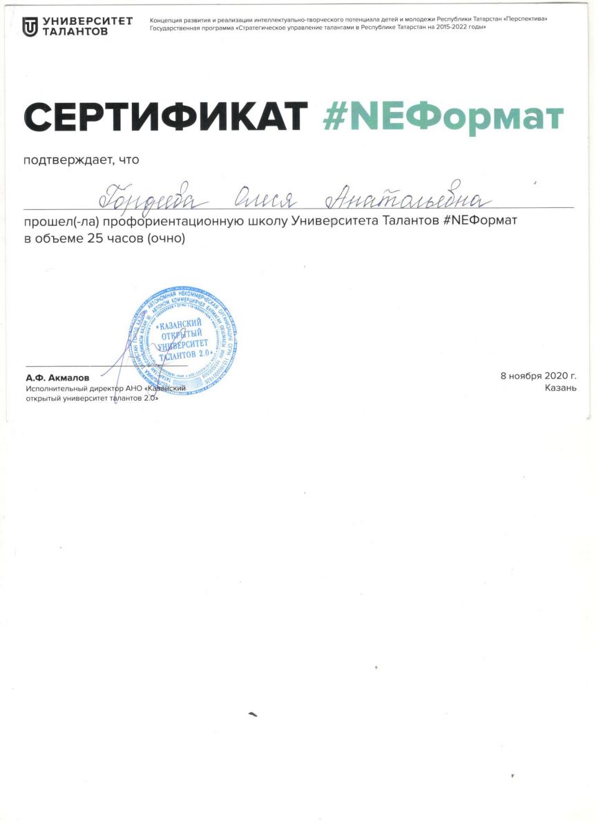 Опубликовано: 16.11.2020В осенние каникулы ученица 10 класса Гордеева Олеся прошла профориентационную школу Универститета талантов NEФормат в очной форме в г. Казань. После занятий куратор вышел на связь через ZOOM, предложил продолжить работу в Университете. Олеся загорелась этой поездкой и предложением и, посоветовавшись с родителями, решила продолжить сотрудничество. Чтобы стать студентом Унверситета талантов Олесе необходимо было посетить вебинары, курсы и получать Дипломы регионального уровней и составить индивидуальный план развития. Таким образом, Олеся стала студенткой Университета талантов.Желаем ей дальнейших успехов!