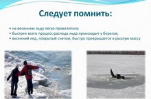 Нельзя выходить на водоемы при образовании ледяных заторов. Не пользуйтесь не санкционированными переходами по льду. Опасно находиться на весеннем льду водохранилищ. Переходить водоемы весной строго запрещается. Особенно недопустимы игры на льду в период вскрытия рек. Прыгать с льдины на льдину и удаляться от берега недопустимо. Такие поступки, как правило, заканчиваются трагически.