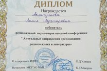 Туган тел һәм туган телдә әдәби уку фәне укытучысы Ахметзянова Лилия Мөхтәр кызы, регион күләмендә Менделеевск шәһәрендә үткән " Туган тел һәм туган телдә әдәбият дәресләрен укытуда булган актуаль юнәлешләр" дип исемләнгән фәнни-гамәли конференциядә катнашып җиңү яулады. Аны мәктәп дирекциясе һәм коллективы исеменнән тәбрик итәбез, эшендә уңышлар телибез!