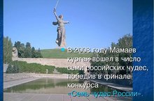 Мамаев курган – господствующая над городом высота(102м) – назван так, вероятно потому, что в период татарского нашествия на нём размещались сторожевые дозоры Мамая. В дни Сталинградской битвы Мамаев курган стал ключевой позицией обороны города. Кто держал вершину кургана в своих руках, тот господствовал над округой. Вот почему здесь столько дней и ночей ( с 28 сентября 1942 года по 26 января 1943 года) бушевала жесточайшая битва. В дни боёв, даже зимой, курган чернел, как обугленный. Мамаев курган стал символом жизни, бессмертной славы ратного и трудового подвига. Все скульптурные композиции созданы народным художником СССР Е.В.Вучетичем. Над своими скульптурами мастер работал 7 лет (январь1961 г. – май 1967 г). 15 октября 1967 года на Мамаевом кургане был открыт величественный памятник – ансамбль героям Сталинградской битвы.(просмотр видеофильма). \На эту тему прошел классный час в 9 б классе.