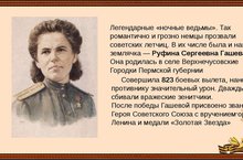 «Ночные ведьмы» Такое зловещее прозвище получили девушки из единственного в истории войны женского полка бомбардировщиков Они стали легендой и для своих, и для чужих. Ни в люфтваффе, ни в военно-воздушных силах других государств не было женских подразделений, а у нас девушки сражались в воздухе и погибали наравне с мужчинами. Произведено 23 672 боевых вылета, иногда перерывы между ними составляли 5 минут. На тему героизма девушек говорили в 10 классе.
