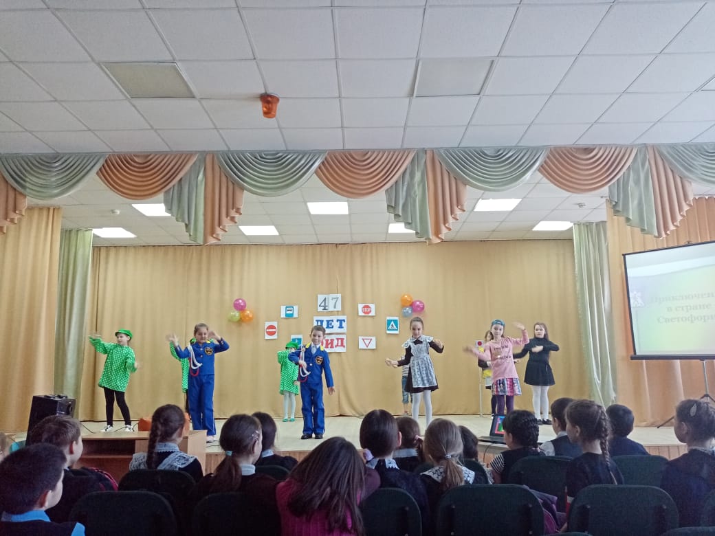 Бүген башлангыч сыйныф укучылары өчен чын бәйрәм оештырылды. Бүген Россиядә Яшь хәрәкәт инспекторлары отрядларының 47 еллыгы булды. Шул уңайдан безнең мәктәп укучылары "Светофория шәһәрендә маҗаралар" дигән темага чара әзерләделәр. Чарада һәр катнашучысының юл хәрәкәте кагыйдәләрен белү буенча викторинада катнашу мөмкинлеге бар иде. Раушания Васимовна Тимкина тагын бер кат балаларга юл кагыйдәләрен белү һәм үтәү мөһимлеге турында искә төшерде.