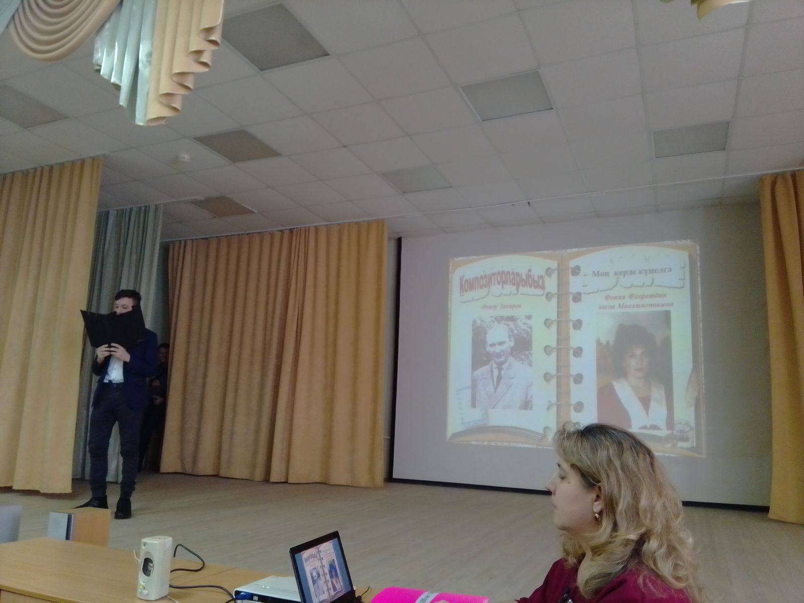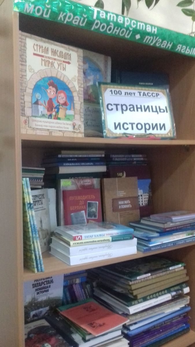 В честь 100-летия ТАССР сегодня в школе на тему "Культура. Искусство.Литература". Библиотекарь Хабибуллина В. А. представила презентацию о выдающихся личностях, активно творивших в период развития Республики Татарстан. Учащиеся 5А и 8А классов выступили с презентацией о выдающихся земляках, которые ведут активную деятельность в области искусства Татарстана. Была организована литературная выставка.