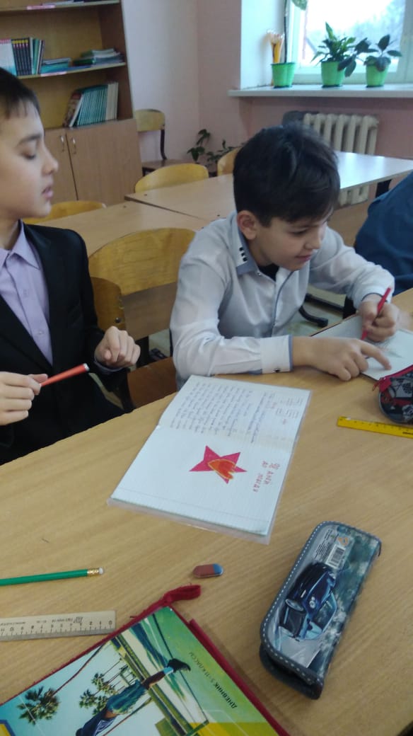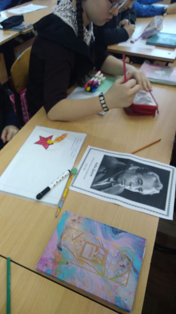 Сегодня в 5 А классе в рамках проекта было проведено внеклассное мероприятие "Писатели и поэты ТАССР-фронтовики". Нуриев Расиль рассказал о Фатихе Кариме, прочитал отрывок из его произведения "За Отчизну" 1942 года, Нафикова Зиля предоставила информацию о Наби Даули. Учащиеся нарисовали Вечный огонь в тетрадях.