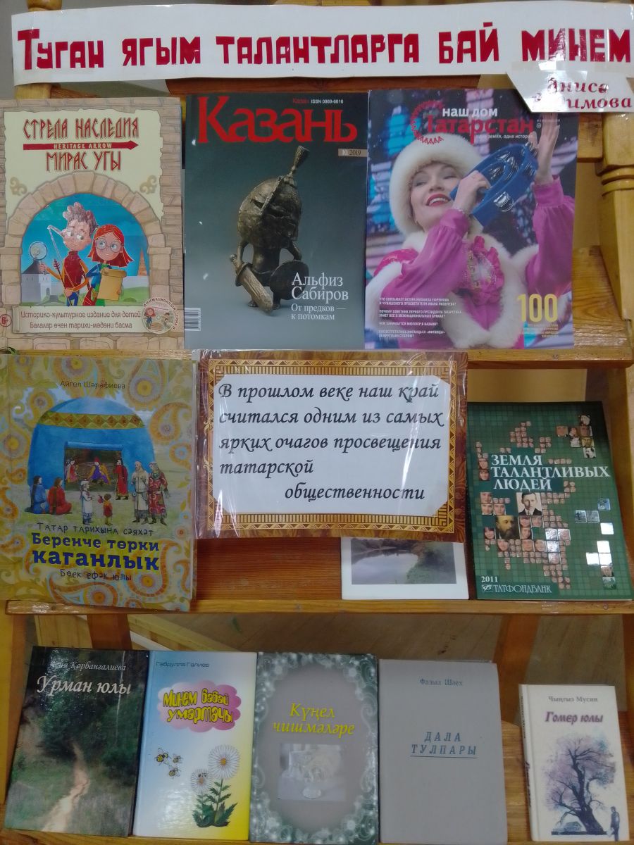 ТАССРның 100 еллыгы уңаеннан буген мәктәп күләмендә "Мәдәният. Сәнгать.Әдәбият" темасына чара үткәрелде. Китапханәче Хабибуллина В.А. Татарстан Республика үсеше чорында актив иҗат иткән күренекле шәхесләр турында презентация тәкъдим итте. 5А һәм 8А сыйныф укучылары Татарстанның сәнгате өлкәсендә актив эшчәнлек алып барган күренекле якташлар турында чыгыш ясадылар, презентация күрсәттеләр. Әдәби күгәзмә оештырылды.