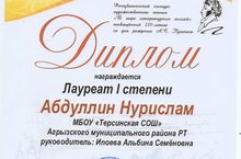 Ученик 2 класса Абдуллин Нурислам (учитель Ипоева А.С.) участвовал в Республиканском конкурсе художественного чтения " В мире литературных мыслей", посвященного 220 - летию со дня рождения А.С.Пушкина и награжден дипломом лауреата 1 степени. Поздравляем и желаем дальнейших творческих успехов.