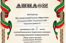 Ученица 7 класса нашей школы Муллахметова Гузель заняла 3-е место в республиканском творческом конкурсе антикоррупционной направленности «Надо жить честно!» в номинации «Плакат» (педагог Давлетова Миляуша Захидовна). Она награждена Дипломом министерства образования и науки Республики Татарстан. Поздравляем их с достойной победой и желаем дальнейших успехов!