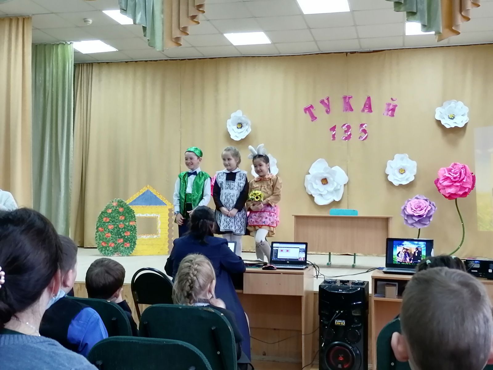 Сегодня в начальных классах прошло мероприятие "Произведения Тукая на сцене". Каждый класс ставил свое произведение. 1-й класс "Гали и коза", 2-й класс "Фатима и Соловей", 3-й класс "Водяная", 3-й класс "Ребенок и бабочка", "Утро", 4-й класс "Интересный шакерт", 4-й класс "Когда дело кончено, можно играть". Все выступления были успешными. В конце участвовали в разгадывании загадок по героям Тукая.
