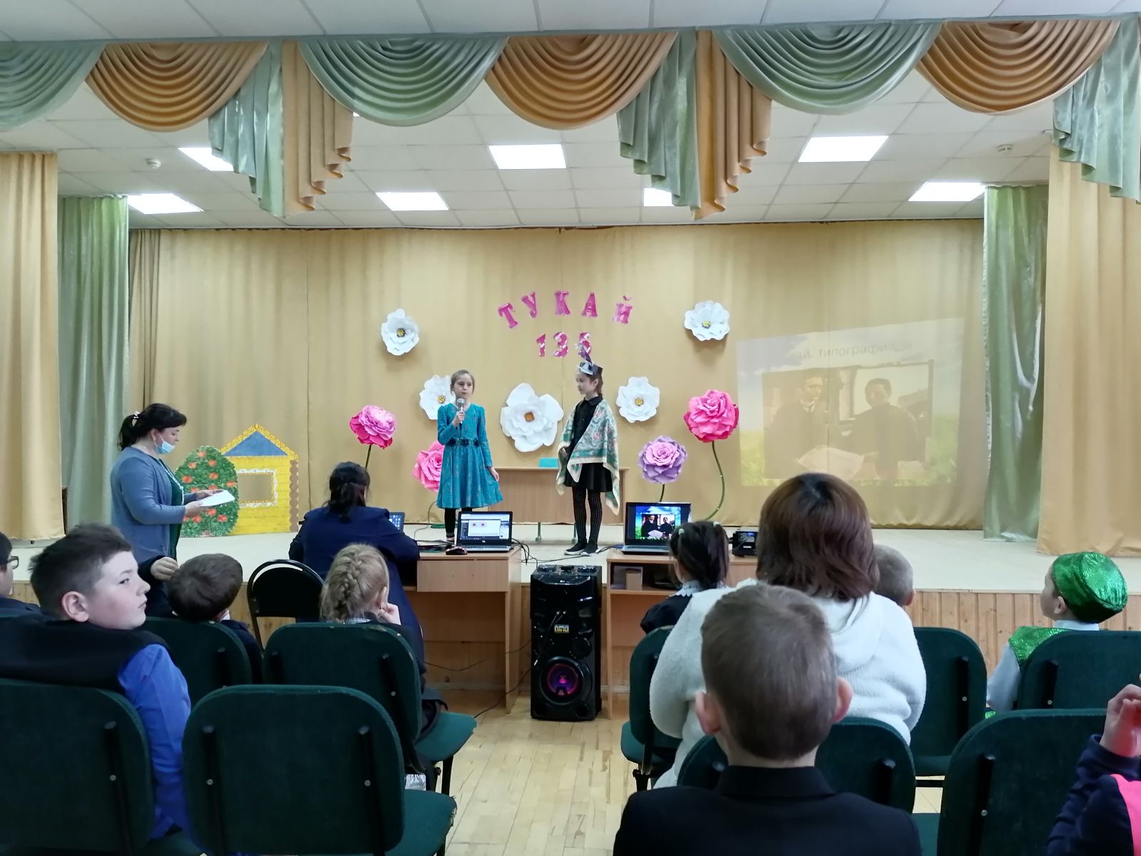 Бүген башлангыч сыйныфларда "Тукай әсәрләре сәхнәдә" дип исемләнгән чара үтте. Һәр сыйныф үзенә бирелгән әсәрне сәхнәләштерде. 1нче сыйныф "Гали белән кәҗә", 2нче сыйныф "Фатыйма белән сандугач", 3нче а сыйныфы "Су анасы", 3нче б сыйныфы "Бала белән күбәләк", "Иртә", 4нче а сыйныфы "Кызыклы шәкерт", 4нче б сыйныфы "Эш беткәч уйнарга ярый" әсәрләрен күрсәттеләр. Бар чыгышлар да уңышлы булды. Ахырда Тукай геройлары буенча табышмаклар чишүдә катнаштылар.