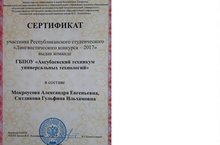 12 декабря 2017 года на базе Казанского нефтехимического колледжа имени В.П. Лушникова состоялся "Лингвистический конкурс - 2017" среди студентов ПОО, где принимали участие команда нашего техникума в составе Мокроусовой А.Е. и Ситдиковой Г.И. Участники получили сертификат от имени директора ГАПОУ "КНХК им. В.П. Лушникова".