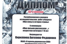 Кириллина Ангелина Федоровнаны "Россия тарихында минем гаиләм" республика конкурсында 3 нче урын алган җиңүләре белән котлыйбыз, "миңа хатлар" номинациясе 7-10 яшь категориясендә. Шулай ук аның педагогы Альметкина Светлана Виктор кызы да катнашты.