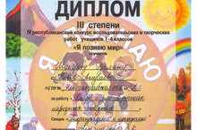 Поздравляем победителя! 13.04.2015 Поздравляем ученика 2 класса Новоаксубаевской школы Шакурова Руслана завоевавшего диплом 3 степени в 4 республиканском конкурсе исследовательских творческих работ учащихся 1-4 классов "Я познаю мир"