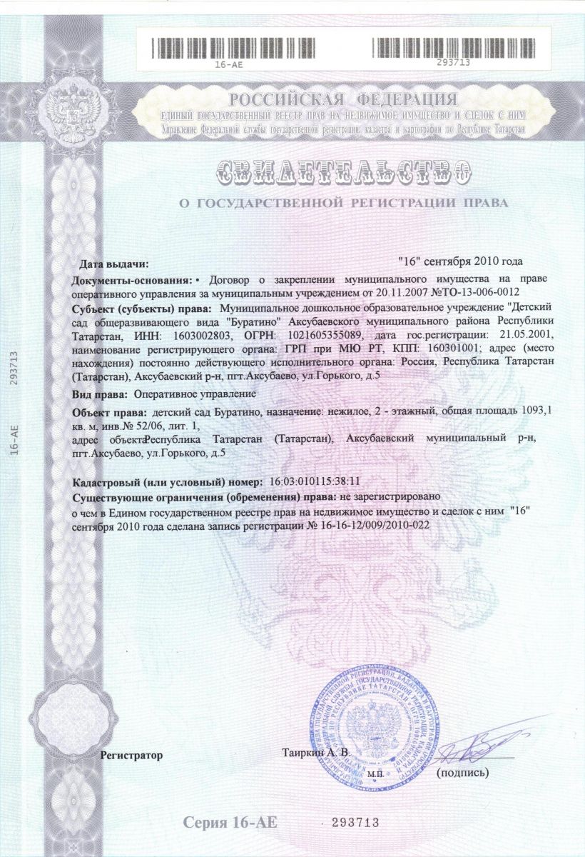 Выписка из ЕГРЮЛ на недвижимое имущество (земля) МБДОУ "Детский сад общеразвивающего вида "Буратино"