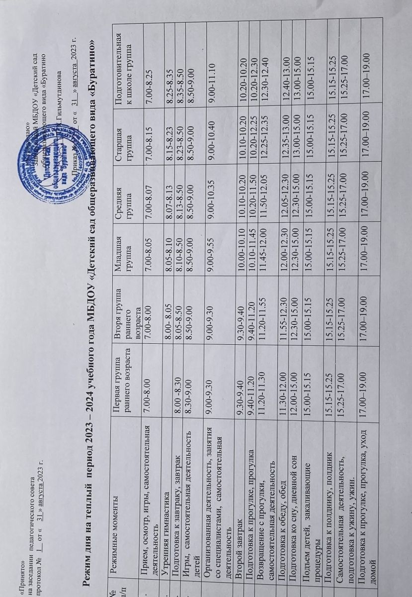 Режим дня на теплый период 2023-2024 учебный год