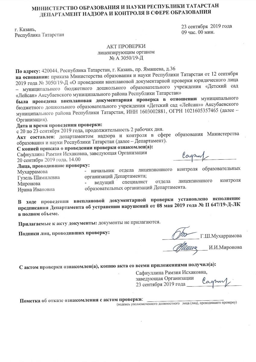 ♦ Предписание об устранении нарушений МОиН РТ. Департамента надзора и контроля в сфере образования.