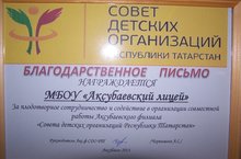 Совет Детских Организаций Республики Татарстан наградил Благодварственным письмом МБОУ "Аксубаевский лицей" за плодотворное сотрудничество и содействие в организации совместной работы.