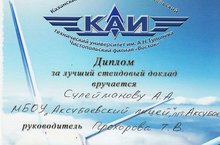 12 апреля на базе КАИ Чистопольского филиала "Восток" состоялась III Республиканская научно- практическая конференция с международным участием " На крыле науки" . Сулейманов Алмаз (11 кл.) стал обладателем Диплома за лучший стендовый доклад в секции "Техническая". Руководитель Прохорова Т.В.