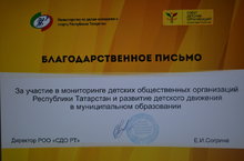 Благодарственным письмом награждена Детская школьная дума нашей школы за участие в мониторинге детских общественных организаций Республики Татарстан и развитие детского движения в муниципальном образовании.