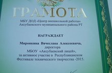 МБУ ДОД "Центр внешкольный работы" наградил Миронкина Вячеслава Алексеевича, директора МБОУ "Аксубаевский лицей", за активное участие в Республиканском Фестивале технического творчества - 2015.