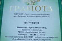 МБУ ДОД "Центр внешкольной работы" наградил грамотой Малюкову Ирину Ильиничну, педагога-организатора МБОУ "Аксубаевский лицей", занявшую третье место по итогам работы за 2014-2015 учебный год среди средних общеобразовательных учреждений района.