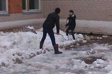 В рамках экологического месячника очищаем территорию школы от остатков снега.