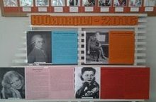 Встречая новый год, мы точно знаем, что он нам принесет много юбилеев многих известных личностей. 2016 год не был исключением и для мира музыки. И сегодня в рамках недели искусства,технологии,ОБЖ и физкультуры в фойе школы была организована красивая выставка фотографий юбиляров, таких как, Анна Герман, Клавдия Шульженко,Сергей Прокофьев, Вольфганг Моцарт и многих других с информацией про них под названием "Музыканты - юбиляры 2016", которая была подготовлена учителем искусства Т.А.Головановой.