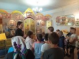 Ребята из летнего лагеря с дневным пребыванием на базе нашей школы совершили экскурсию в местный Молитвенный дом в честь Святых мучениц Веры, Надежды и Любови и их матери Софии. Настоятель храма отец Антоний ознакомил детей с историей храма, рассказал об убранстве и строительстве молитвенного дома, об молитвах и иконах.Отец Антоний также затронул тему про антитеррор и экстремизм, провёл беседу о христианском учении о добре и зле. По окончании беседы, священник ответил на возникшие у учащихся вопросы по данной теме и пожелал ребятам помощи Божией в новом учебном году!