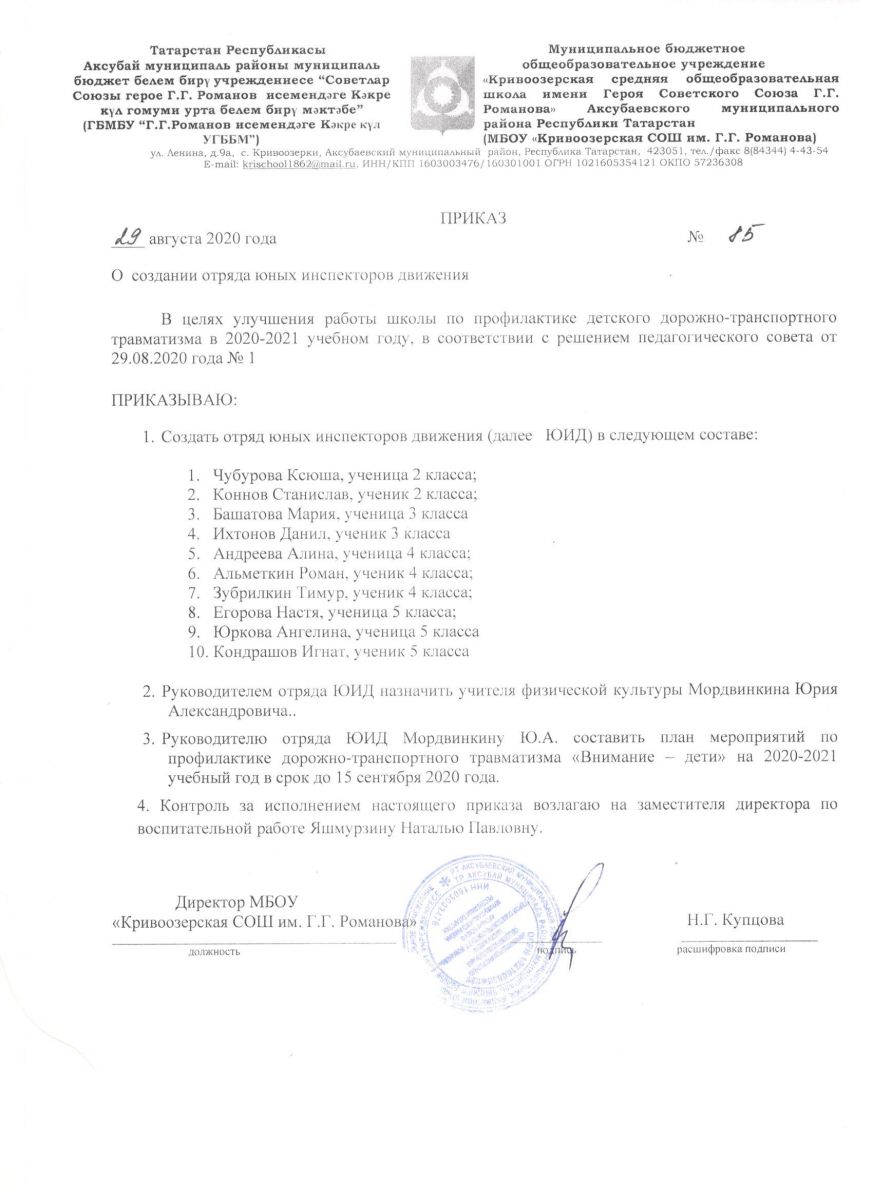 Приказ о закреплении руководителя отряда ЮИД и создании отряда ЮИД на 2022-2023 учебный год