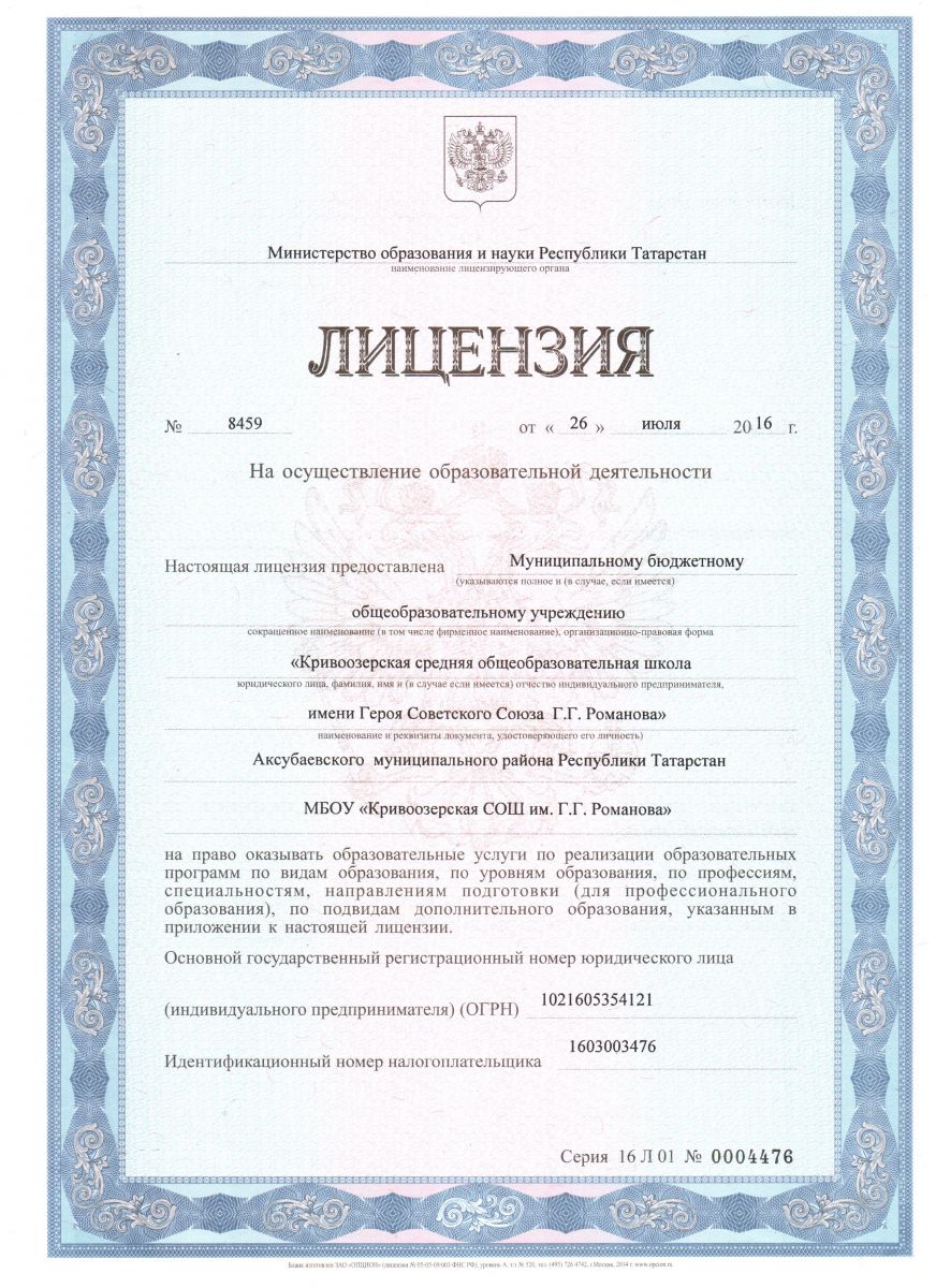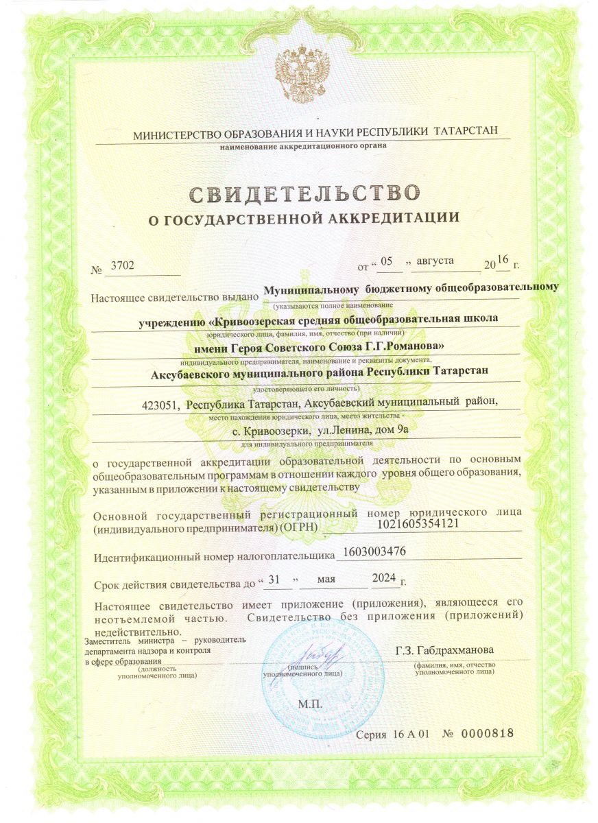 Муниципальное бюджетное общеобразовательное учреждение "Кривоозерская средняя общеобразовательная школа имени Героя Советского Союза Г.Г. Романова" Аксубаевского муниципального района Республики Татарстан/ Татарстан Республикасы Аксубай муниципаль районы муниципаль бюджет белем бирү учреждениесе “Советлар Союзы герое Г.Г. Романов исемендәге Кәкре күл гомуми урта белем бирү мәктәбе”