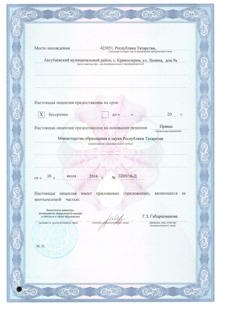 | Адрес: | 423051, РТ, Аксубаевский муниципальный район, с. Кривоозерки,улица Ленина, д.9а |