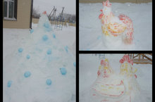 Сегодня у дверей садика выросли снежные композиции: это и снеговик, и символ наступающего года - петушок, и его подружка - курочка, и елочка.