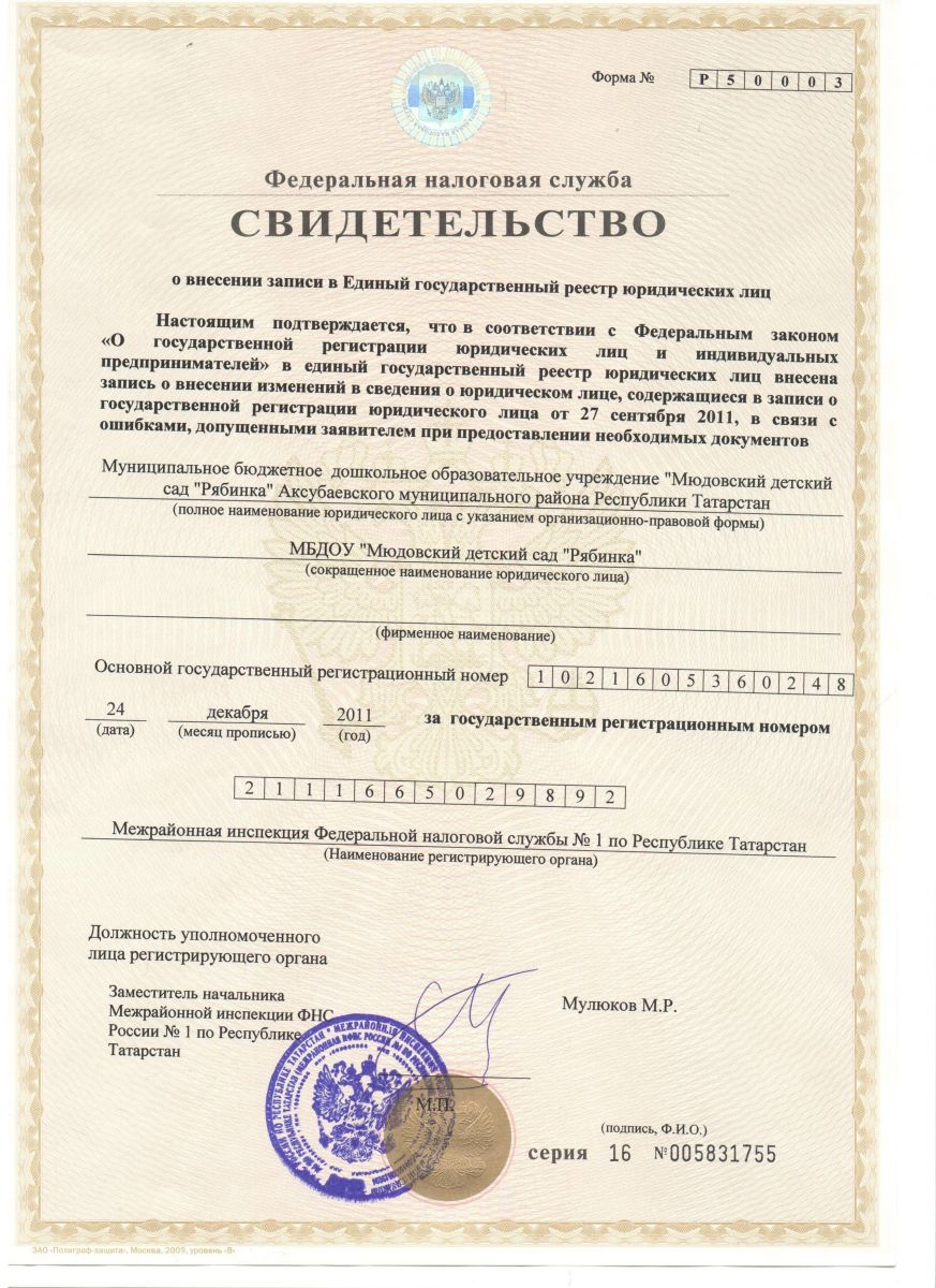Свидетельство ЕГРЮЛ от 24.12.2011 года