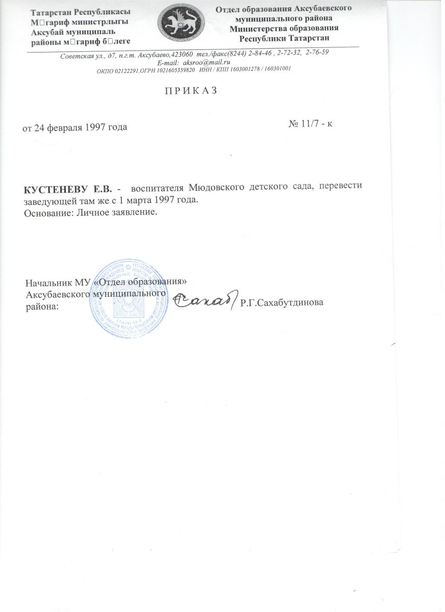 Приказ о назначении руководителя № 11/7-к от 24.02.1997г.