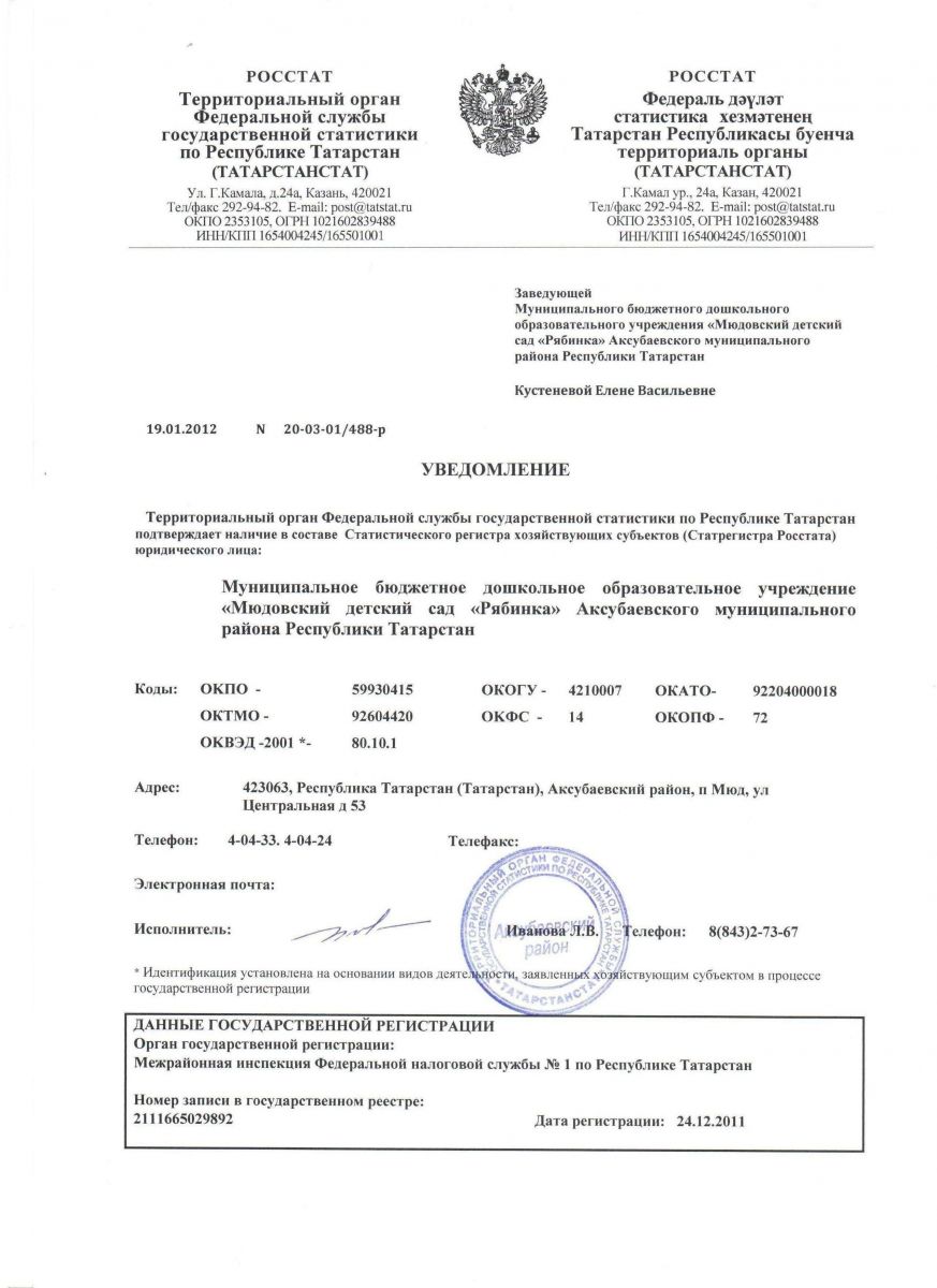 РОССТАТ Данные регистрации от 24.12.2011 года