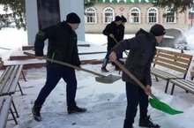 Мәктәп укучылары Бөек Ватан сугышында катнашучылар, һәлак булучылар истәлегенә куелган обелиск, истәлек ташлары тирәсен кардан чистартып торалар.