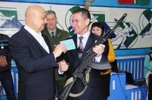 Выпускник нашей школы, на сегодняшний день доктор экономических наук, профессор, Почетный работник высшего профессиональгого образования Российской Федерации, заслуженный деятель науки Республики Татарстан И.З.Гафиятов подарил учащимся макет автомата Калашникова.