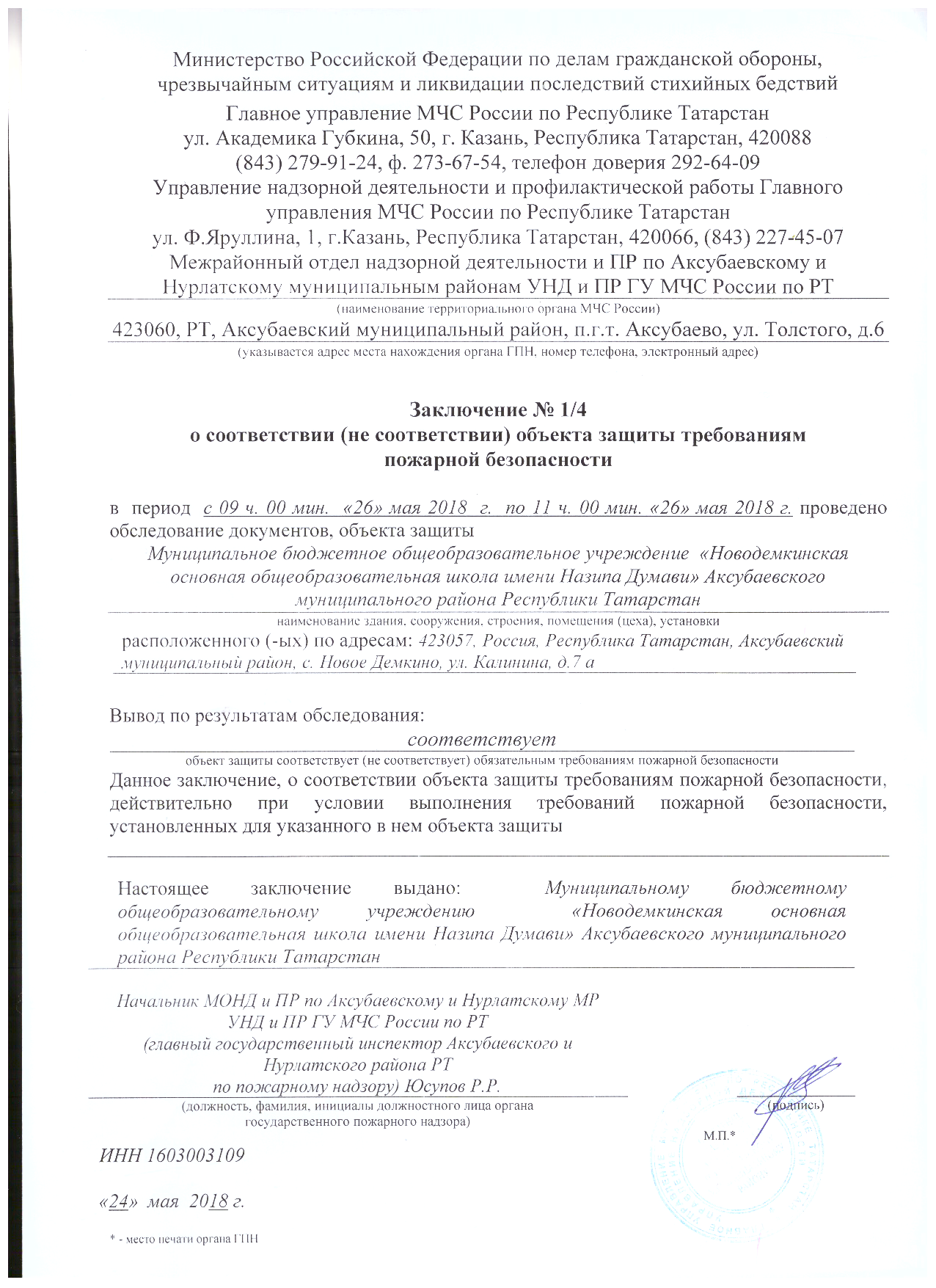 Заключение о соответствии требованиям пожарной безопасности/ Янгын куркынычсызлыгы таләпләренә җавап бирү турында нәтиҗә