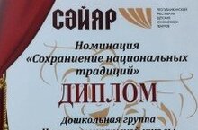 Поздравляем воспитателя дошкольной группы Ярославлеву Н.Н. и её воспитанников с победой в Республиканиском фестивале детских юношеских театров "Саяйар" в номинации "Сохранение национальных традиций"