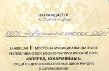 Итоги игры "Вперёд, юноармейцы!" 22.02.2017 Команда нашей школы приняла участие на муниципальном этапе военно-патриотической игры "Вперёд, юноармейцы!"и заняла 2 место в конкурсе "Челночный бег",а также 2 место в конкурсе "Разборка и сборка АК-74". Поздравляем участников: Пронькина Д, Ижотова А, Спирину А, Чудинова Д, Морева Э и руководителя команды Сандимирова Н.М.