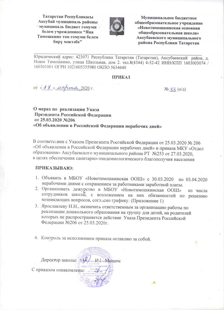 Приказ МБОУ "Новотимошкинская ООШ" об организации дистанционного обученя