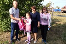 Глава Новоаксубаевского сельского поселения Макаров А.В. вручил портфель первокласснице Юмартовой Виолетте. -