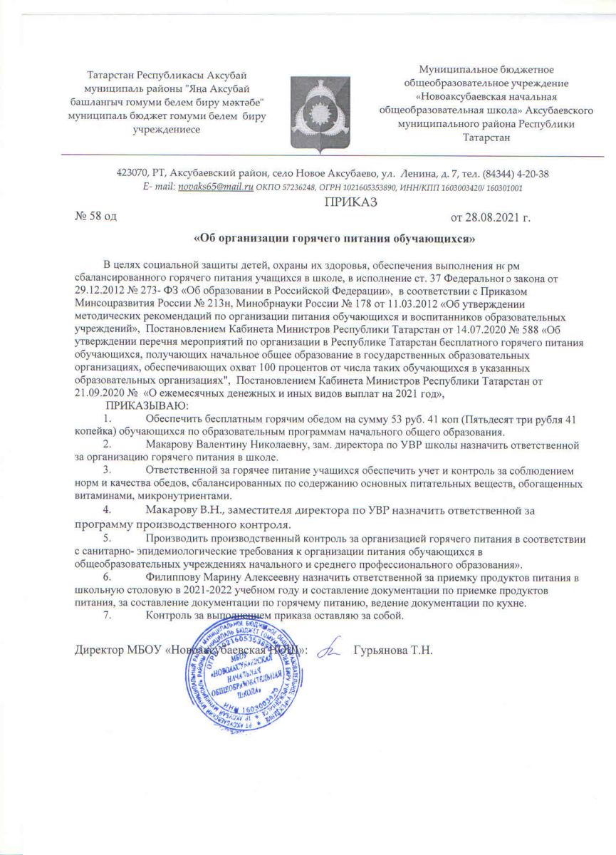 Приказ МБОУ "Новоаксубаевская НОШ" "Об организации горячего питания обучающихся"