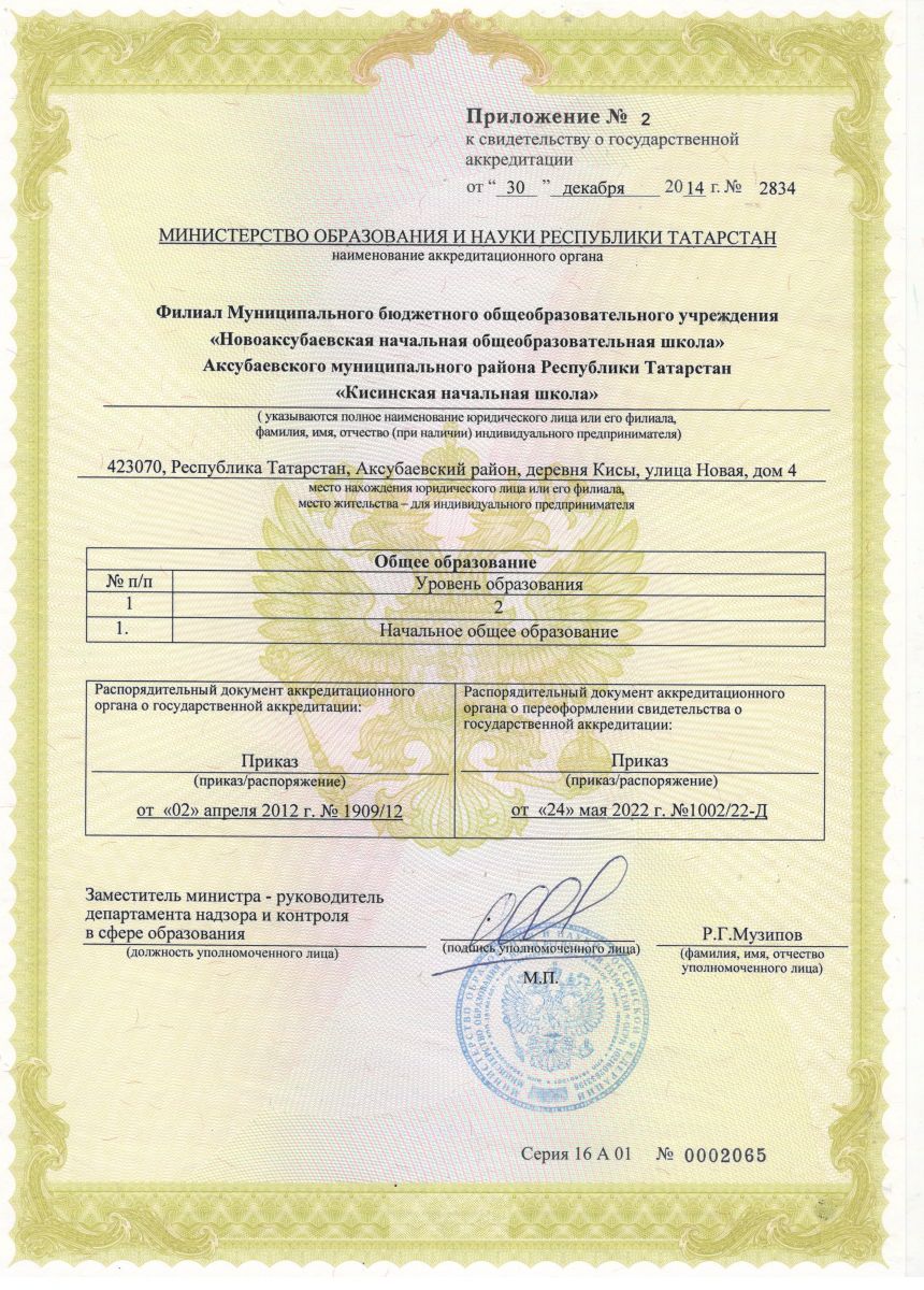 Свидетельство о государственной аккредитации МБОУ "Новоаксубаевская НОШ" с приложением