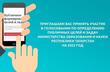 Приглашаем вас принять участие в голосовании по определению публичных целей и задач Министерства образования и науки Республики Татарстан на 2023 год, которое проходит на Портале госуслуг РТ