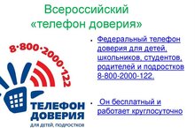 8 800 2000 122 - единый общероссийский номер детского телефона доверия - просто позвони в трудную минуту. Служба детского телефона доверия работает круглосуточно, анонимно и бесплатно, с домашнего и мобильного телефонов. Если линия занята, позвони в другое время. Будь настойчив в решении своих проблем.