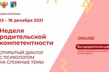 ♦ С 13 по 18 декабря 2021 года пройдет Неделя родительской компетентности – открытый диалог с психологом на сложные темы. Мероприятие будет проходит в онлайн-формате.