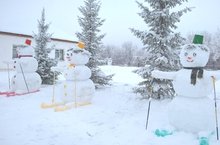 Силами учащихся и работников школы около ёлочек возникла семья Снеговичков. Папа, мама и сын отправляются кататься на лыжах .