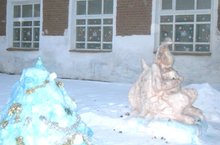 ♦ Ученики школы, совместно с родителями, учителя украшают двор школы снежными фигурами. На входе гостей встречают символ 2016 года- обезьяна, новогодние елки и целый отряд снеговиков.